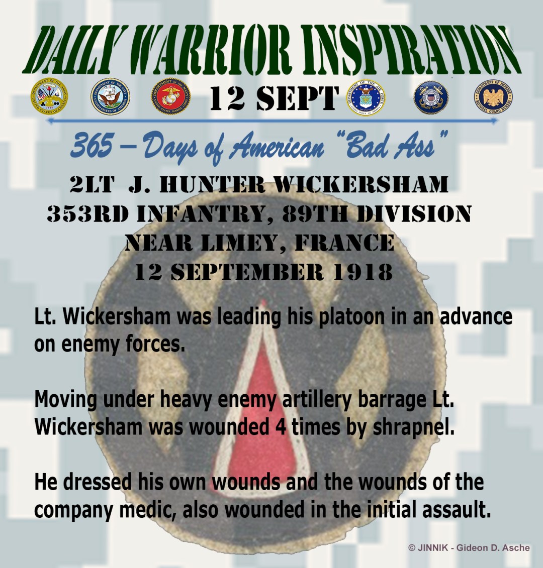 2Lt J. HUNTER WICKERSHAM 353d Infantry, 89th Division Near Limey, France 12 September 1918 Moving under heavy enemy artillery barrage Lt. Wickersham was wounded 4 times by shrapnel as he led his platoon in an advance on enemy forces. He dressed his own wounds and the wounds of the company medic, also wounded in the … Continue reading 12 September