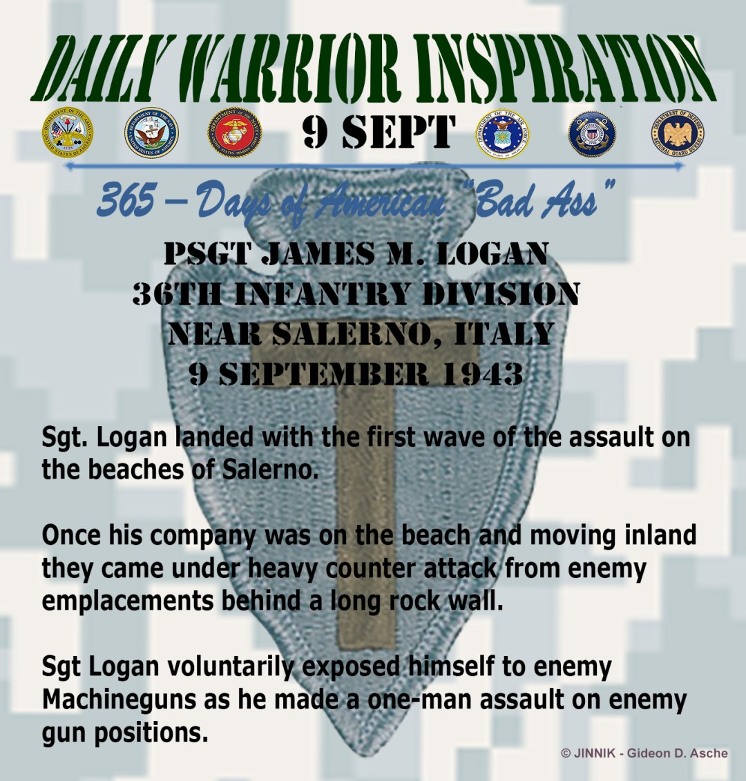 PSGT JAMES M. LOGAN 36th Infantry Division Near Salerno, Italy 9 September 1943 Sgt. Logan landed with the first wave of the assault on the beaches of Salerno. Once his company was on the beach and moving inland they came under heavy counter-attack from enemy emplacements behind a long rock wall. Sgt Logan voluntarily exposed himself … Continue reading 9 September