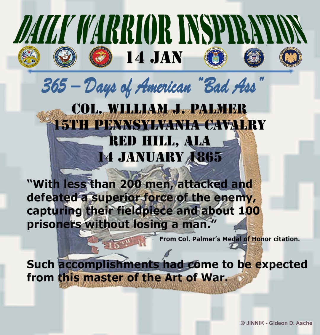 Col. WILLIAM J. PALMER15th Pennsylvania CavalryRed Hill, Ala14 January 1865 All that Col. Palmer’s Medal of Honor citation states is: “With less than 200 men, attacked and defeated a superior force of the enemy, capturing their fieldpiece and about 100 prisoners without losing a man.” At just 25, very early in the Civil War, Palmer … Continue reading 14 January