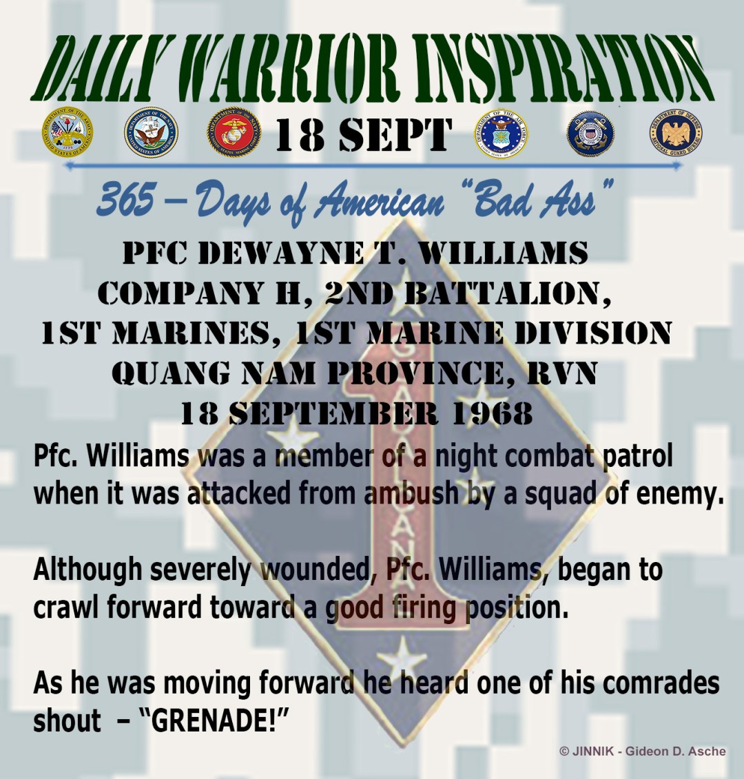 Pfc DEWAYNE T. WILLIAMSCompany H, 2d Battalion,1st Marines, 1st Marine DivisionQuang Nam Province, RVN18 September 1968 Pfc. Williams was a member of a night combat patrol when it was attacked from ambush by a squad of enemy using small arms and hand grenades. Although severely wounded, Pfc. Williams, began to crawl forward toward a good … Continue reading 18 September