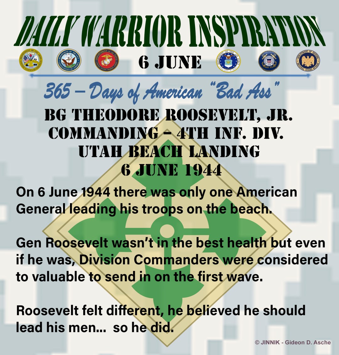 BG THEODORE ROOSEVELT, JR. Commanding – 4th Inf. Div. D-Day Utah Beach Normandy 6 June 1944 On 6 June 1944 there was only one American General leading his troops on the beach. Gen Roosevelt wasn’t in the best health but even if he was, Division Commanders were considered too valuable to send in on the first … Continue reading 6 June