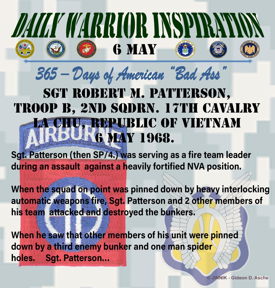 SGT ROBERT M. PATTERSON, Troop B, 2nd Sqdrn. 17th Cavalry La Chu, Republic of Vietnam 6 May 1968. While serving as a Sgt. Patterson (then Sp4.) was serving a fire team leader during an assault against a heavily fortified NVA position. When the squad on point was pinned down by heavy interlocking automatic weapons, Sgt. … Continue reading 6 May