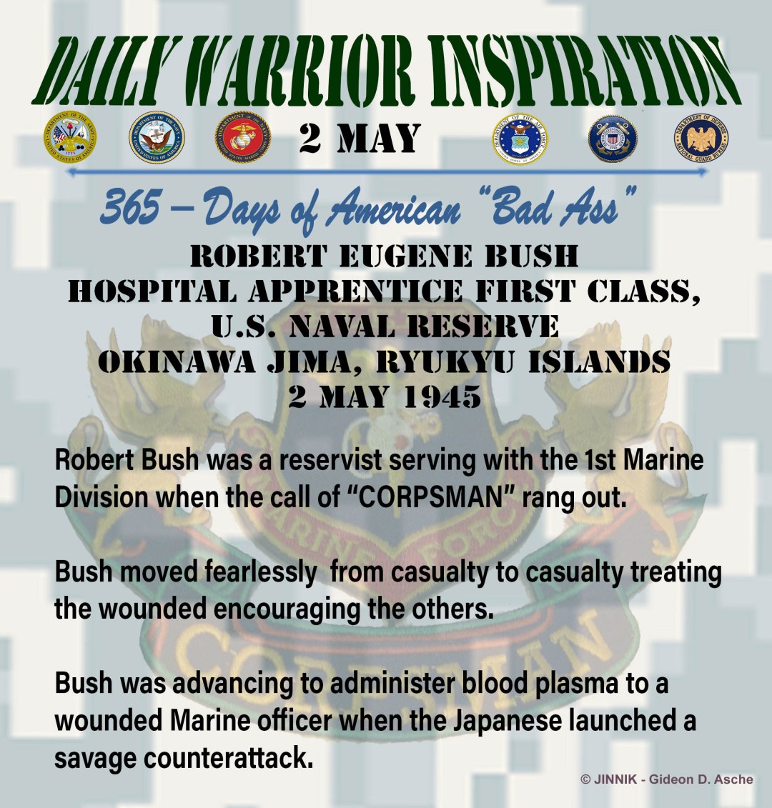 Robert Eugene Bush Hospital Apprentice First Class, U.S. Naval Reserve Okinawa Jima, Ryukyu Islands 2 May 1945 Robert Bush was a reservist serving as Medical Corpsman with a rifle company with the1st Marine Division when the call of “CORPSMAN” rang out. Bush Fearlessly moved from casualty to casualty, attending the wounded despite the hail of … Continue reading 2 May