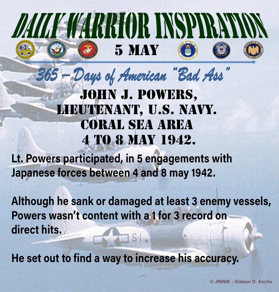 Lt. JOHN J. POWERS, U.S. Navy. Coral Sea area 4 to 8 May 1942. Lt. Powers participated in 5 engagements with Japanese forces between 4and 8 May 1942. Powers wasn’t content with a 1 for three record on direct hits, so he set out to find a way to increase his accuracy. He scored a direct hit, … Continue reading 5 May