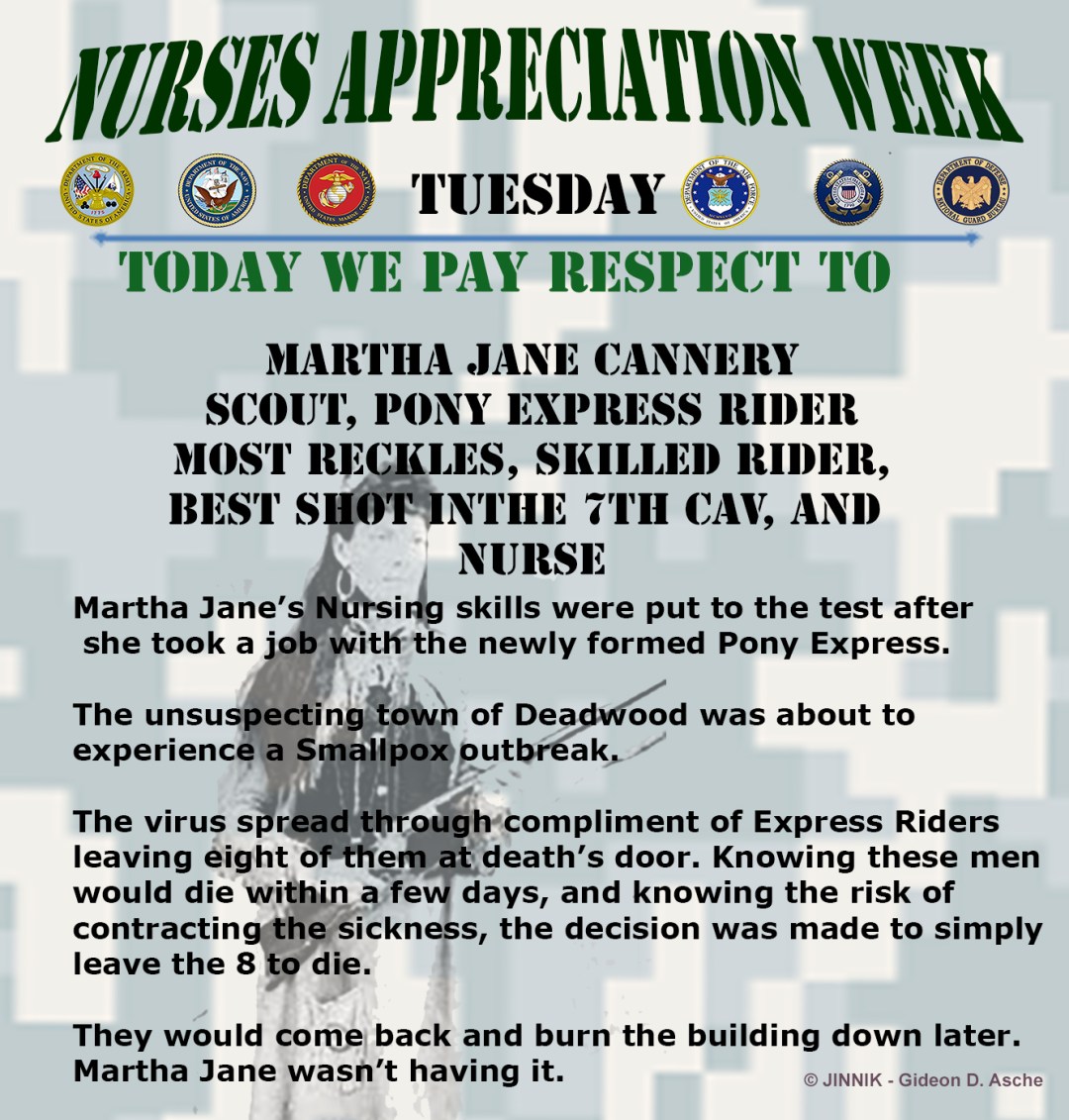 Today we pay respect to Martha Jane Cannary. Martha Jane learned her nursing skills out of necessity after both of her parents died in 1865 when she became the sole breadwinner and head of a family consisting of six children under the age of 11. Martha took any and every job that most men thought … Continue reading Nurses Appreciation Week – Tuesday