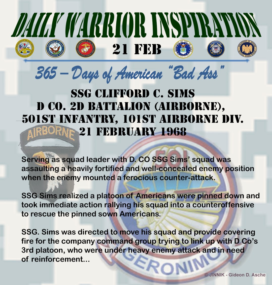 SSG Clifford C. Sims D Co. 2d Battalion (Airborne), 501st Infantry, 101st Airborne Div. 21 February 1968 Serving as squad leader with D. CO SSG Sims’ squad was assaulting a heavily fortified and well-concealed enemy position when the enemy mounted a ferocious counter-attack. SSG Sims realized a platoon of Americans were pinned down and took … Continue reading 21 February