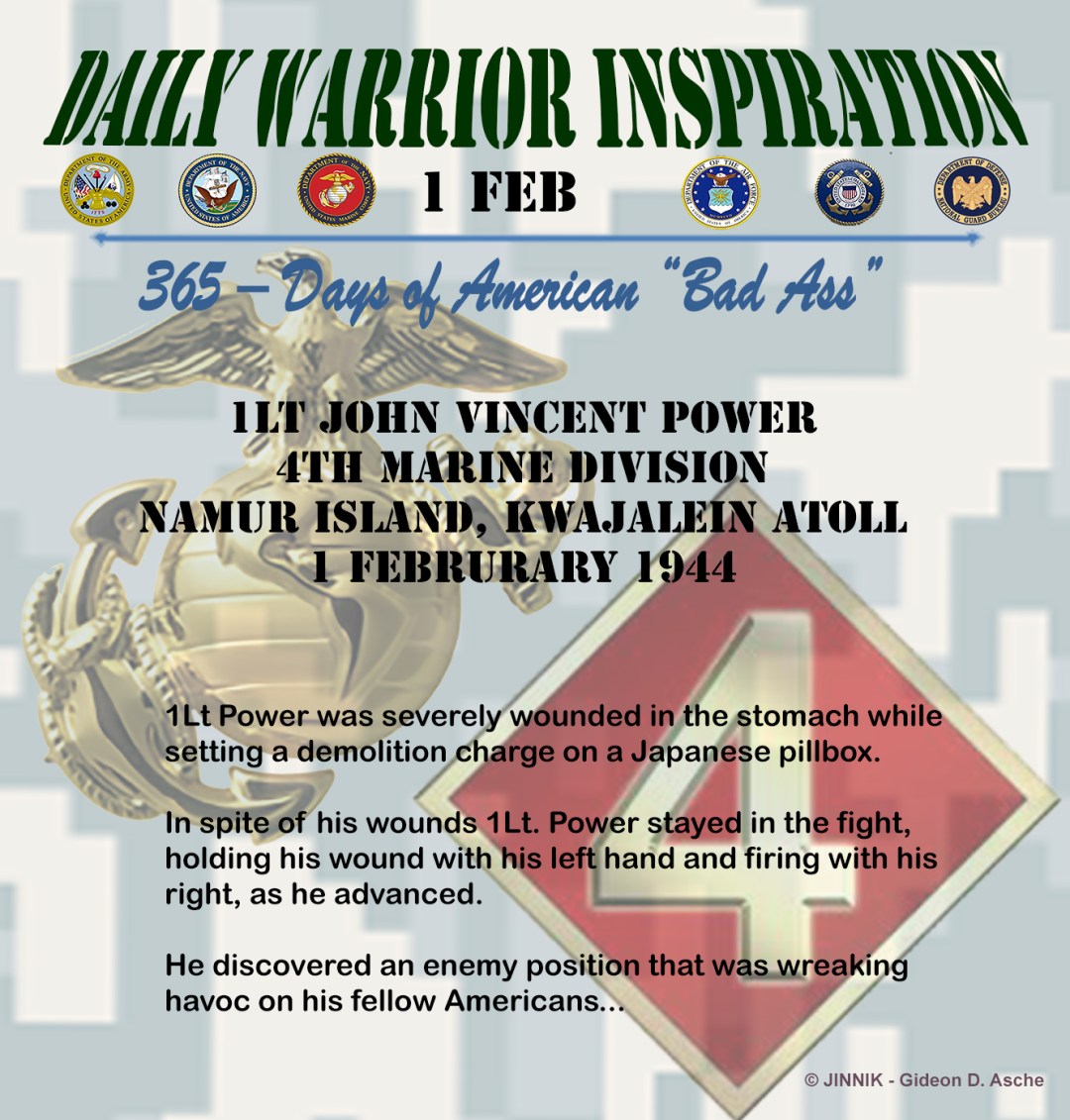 1Lt JOHN VINCENT POWER 4th Marine Division Namur Island, Kwajalein Atoll 1 February 1944 1Lt Power was severely wounded in the stomach while setting a demolition charge on a Japanese pillbox, In spite of his wounds 1Lt. Power stayed in the fight, holding his wound with his left hand and firing with his right, … Continue reading 1 February