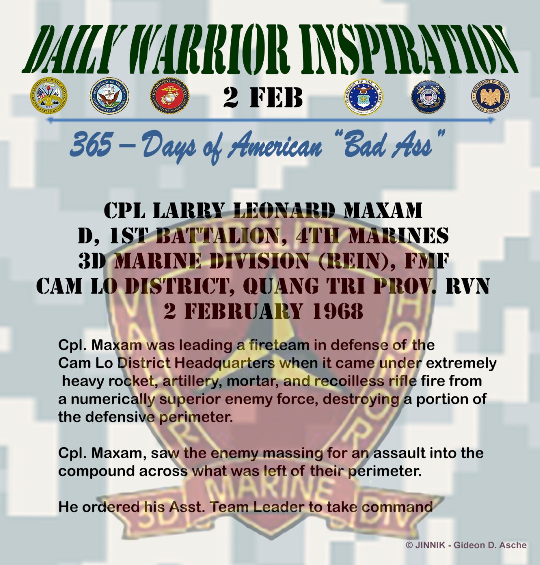 CPL LARRY LEONARD MAXAM D, 1st Battalion, 4th Marines 3d Marine Division (Rein), FMF Cam Lo District, Quang Tri Prov. RVN 2 February 1968 Cpl. Maxam was leading a fireteam in defense of the Cam Lo District Headquarters when it came under heavy rocket, artillery, mortar, and recoilless rifle fire from a numerically superior enemy … Continue reading 2 February