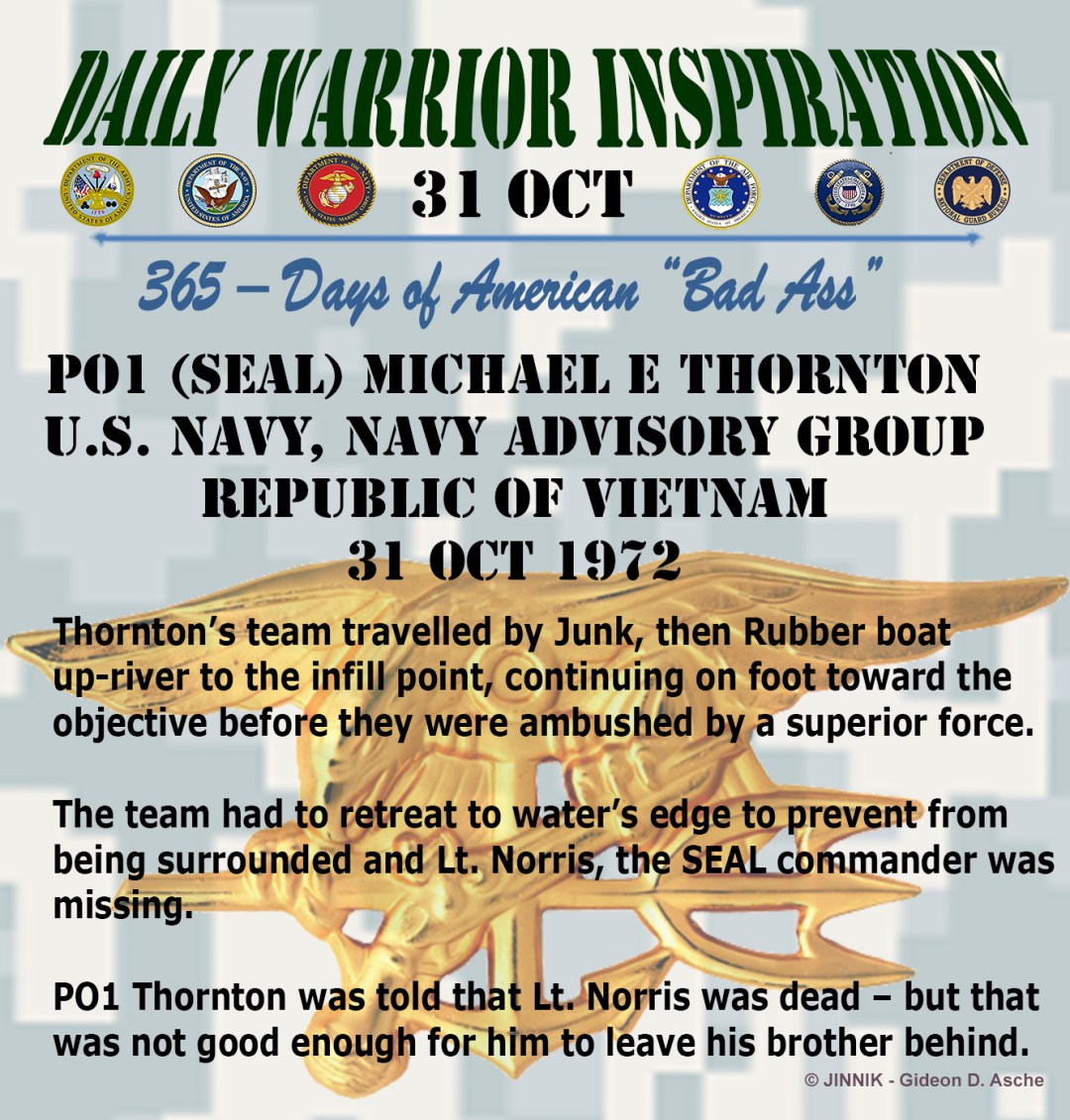 PO1 (SEAL) MICHAEL E THORNTON U.S. Navy, Navy Advisory Group Republic of Vietnam 31 October 1972 Petty Officer Thornton and another SEAL, along with a 3-man Vietnamese SEAL Team, were participating in an intelligence gathering and prisoner capture operation. Thornton’s Team traveled by Junk then Rubber boat up-river to the infill point, continuing on foot … Continue reading 31 October