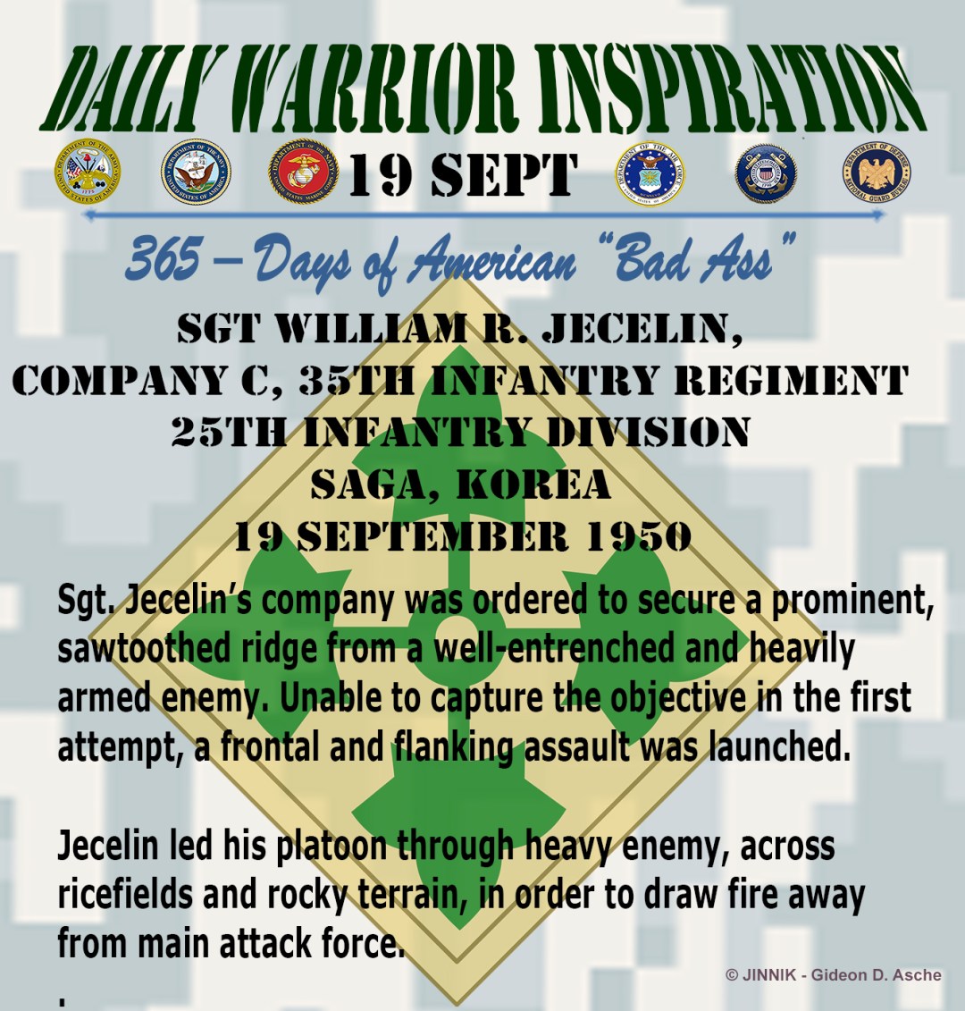 SGT WILLIAM R. JECELIN, Company C, 35th Infantry Regiment 25th Infantry Division Saga, Korea 19 September 1950 Sgt. Jecelin’s company was ordered to secure a prominent, sawtoothed ridge from a well-entrenched and heavily armed enemy. Unable to capture the objective in the first attempt, a frontal and flanking assault was launched. Jecelin led his platoon … Continue reading 19 September