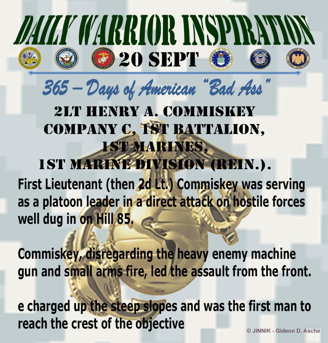 1Lt HENRY A. COMMISKEY SR. Company C, 1st Battalion 1st Marines, 1st Marine Division (Rein.) Yongdungp’o, Korea 20 September 1950 Ordered to attack and eliminate hostile forces well dug in on Hill 85, 1st Lt. Commiskey, spearheaded the assault, charging up the steep slopes on the run. Disregarding the heavy enemy machine gun and … Continue reading 20 September